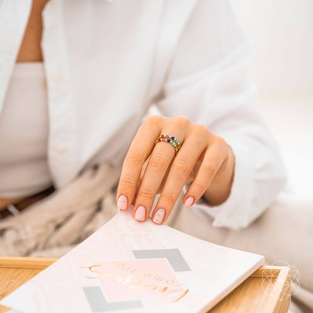 Olivine: Also called Peridot, this olive-hued gem works perfectly with the other stones in the ring to align chakras. It will invite abundance into your soul.